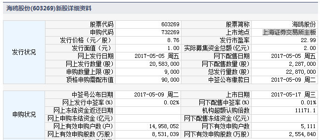 根据交易所公告,江苏海鸥冷却塔股份有限公司于2017年5月17日起在上海证券交易所主板上市交易。