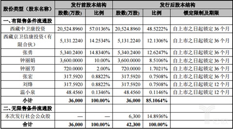 据公告书介绍,卫信康在发售前持股比率排名前五的是西藏中卫康投资,西藏京卫信康投资(有限合伙),张勇,钟丽娟和钟丽芳,分别持股占比57.01%,14.25%,14.83%,10.00%和2.00%。据亿欧调查,西藏中卫康投资及西藏京卫信康投资(有限合伙)的实际控制人皆为张勇。