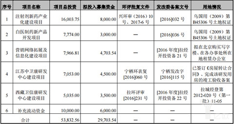 关于公司未来的发展,公告书称,将主要投入注射剂新药产业化建设项目、白医制药新产品开发项目、营销网络拓展及信息化建设项目、江苏中卫康研发中心建设项目和西藏卫信康研发中心建设项目。