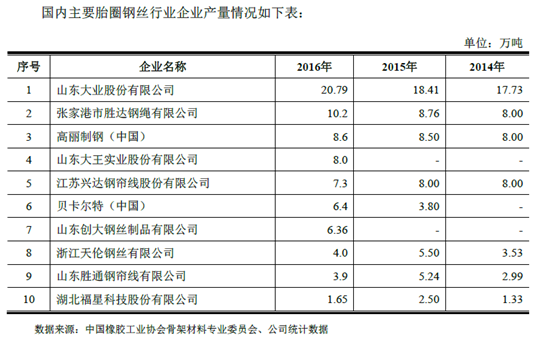 常言道:高手过招,控局者胜。经过多年发展,大业股份凭借突出的技术研发能力和制造工艺水平,已经确立了自己在橡胶骨架材料行业中的市场地位,发展成为目前国内规模最大的胎圈钢丝制造企业。公司目前主要生产普通性能胎圈钢丝和高性能胎圈钢丝两大系列产品,规格型号共有几十种,客户遍布全国各地以及国际市场。2014年、2015年、2016年及2017年上半年,公司胎圈钢丝的总产量分别为17.73万吨、18.41万吨、20.79万吨及10.73万吨,2014年、2015年分别占整个国内市场份额的27.62%、28.41%,行业地位突出。