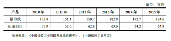 我国胎圈钢丝行业起步较晚,但借助国内汽车行业和轮胎行业高速发展的推动力,胎圈钢丝行业发展迅速,胎圈钢丝产能也得到快速提高,截至“十二五”末,国内胎圈钢丝生产能力已经达到90万吨左右。
