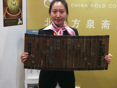 在方泉斋展台,记者看到,泉友们对《永通万国指尖陀螺》饶有兴趣。据方泉斋法人代表王雪阳介绍,《永通万国指尖陀螺》的构思来自流行的减压玩具——指尖陀螺,又巧妙地以“北周三品”之首的“永通万国”古钱币为素材,钱文采用了书法华美的玉筋篆,“永通”意为永远通行,“万国”示天下万国可用。这款新品匠心独运,精巧美观,是融古钱文化和书法于一体的纪念品,《中国古代钱币鉴赏》则依中国历史大系为脉络,精选有代表性的钱币实物30枚,这些钱币皆为真品,具有珍贵的文化内涵和收藏价值。