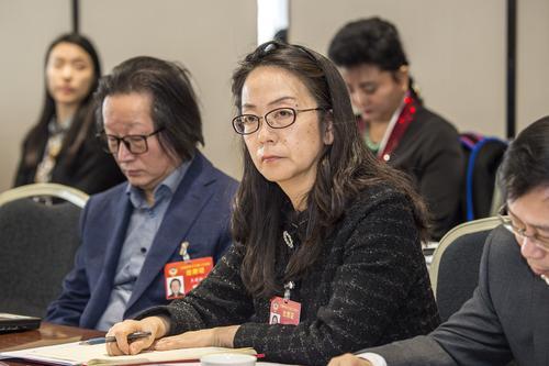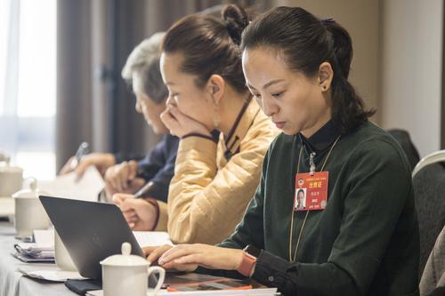 全国政协委员、中国残疾人艺术团团长邰丽华(右一)在文艺界别小组会上整理提案,她建议国家尽快落实残疾儿童入学评估机制,确保入学零拒绝。