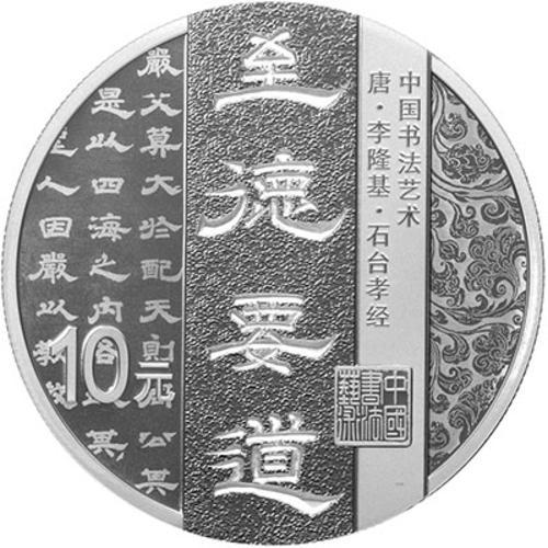 “石台孝经”30克银币,以李隆基《石台孝经》中“至德要道”四字作为突出表现的主体图案,将碑文的精彩局部作为背景,加入了同时期传统纹饰图案等进行组合设计。币面偏右近币缘处刊主题文字“中国书法艺术·唐·李隆基·石台孝经”。