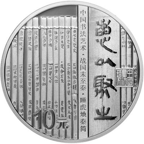 “睡虎地秦墓竹简”30克银币,以睡虎地秦墓竹简中“惠以聚之”四字作为突出表现的主体图案,将竹简的精彩局部作为背景。币面中线偏右处刊主题文字“中国书法艺术·秦·睡虎地秦墓竹简”。