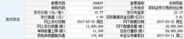 上海华测导航技术股份有限公司于2017年3月10日进行网上和网下申购。公司本次公开发行股票总数量为2,980 万股。回拨机制启动前,网下初始发行数量1,800 万股,占本次发行总股数的60.40%;网上初始发行数量1,180 万股,占本次发行总股数的39.60%。公司本次发行价格12.77元/股,发行市盈率为22.17倍。股票简称为“华测导航”,股票代码为“300627”。拟登陆深交所创业板上市。