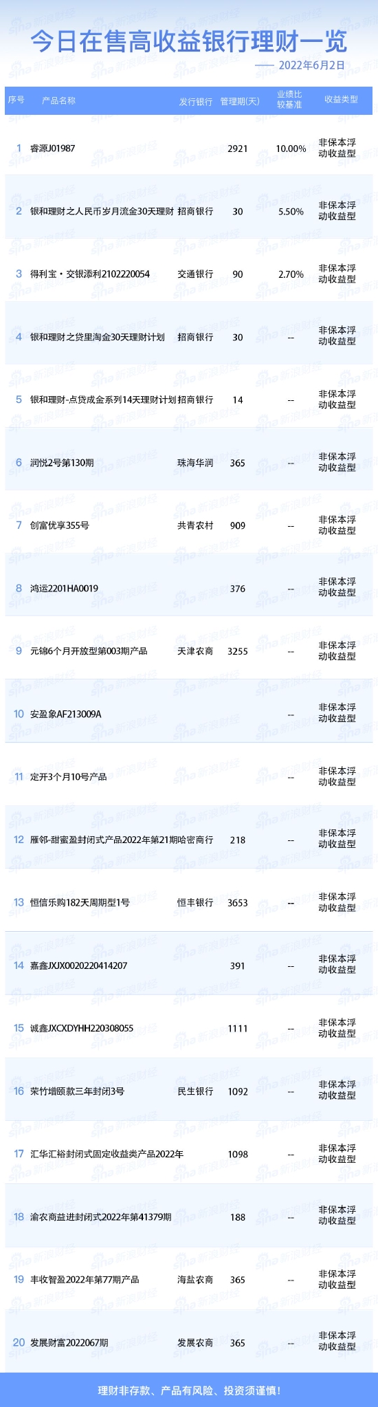 6月2日在售高收益银行理财产品一览。今日业绩比较基准在2.70%及以上的银行人民币理财产品共3款。理财非存款、产品有风险、投资须谨慎!
