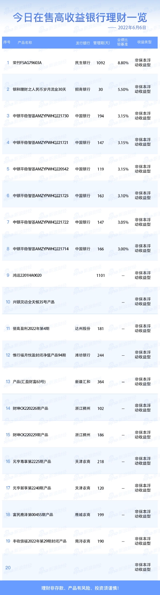 6月6日在售高收益银行理财产品一览