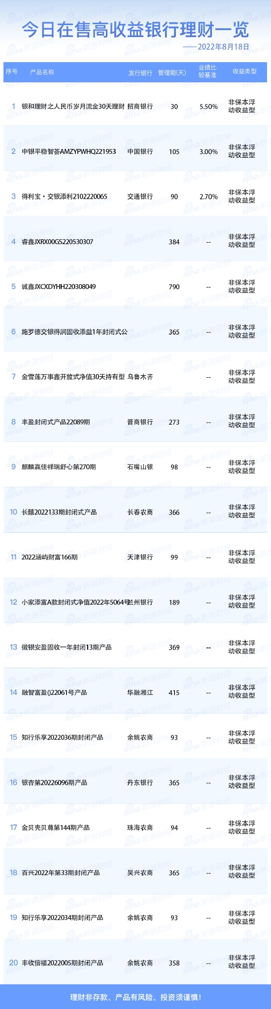 8月18日在售高收益银行理财产品一览