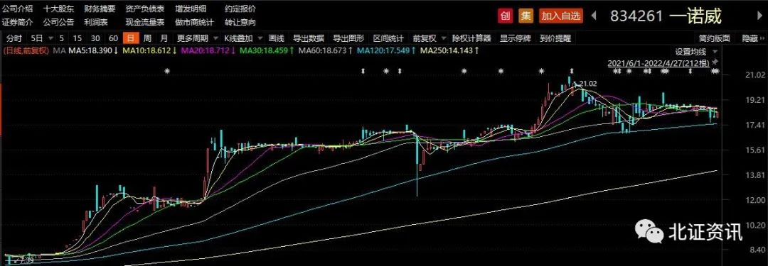 下调后,一诺威此次发行底价明显低于其申报北交所上市前夕的股价。二级市场上,一诺威在全国股转系统成交相当活跃,2021年下半年以来出现了多轮上升行情,2022年2月股价一度触及21元,停牌前一个交易日(2022年4月27日)收报18.43元。