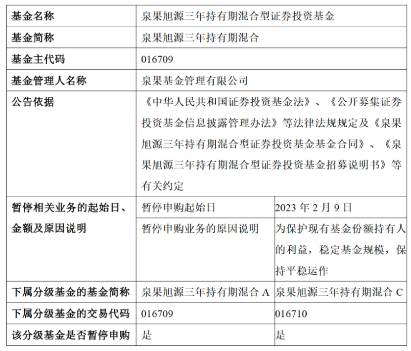 而在2月8日盘后,泉果基金再度公告,泉果旭源三年持有将于2月9日起暂停申购。