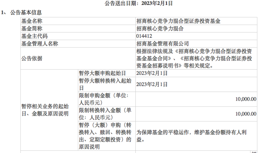 在明星基金方面,2月1日,朱红裕管理的招商核心竞争力宣布当日限购1万元。春节前的1月11日及1月16日,该产品曾分别公告限购10万元和5万元。短短二十余天,该产品便追加了三道“限购令”。