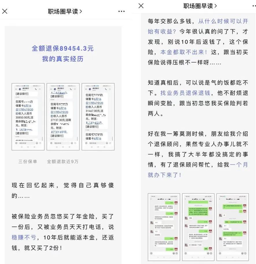 近日,来自微信公众号“职场圈早读”的一篇《退保=亏?成功退保4万元,我的经验值得所有人借鉴》的文章,成功引起了不少读者的注意。记者点进去之后才发现,原来这是一则疑似“代理退保”的软文广告。