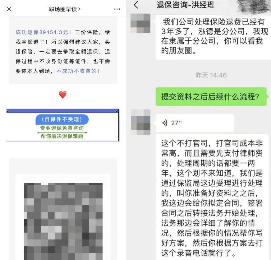 “成功退保89454.3元!三份保险,给我全额退了!”“有了退保顾问帮忙,给我一个月就办下来了”……文章中对所谓的“代理退保”成功案例的描述毫不掩饰,甚至还在文末留下了醒目的退保咨询经理的微信二维码。