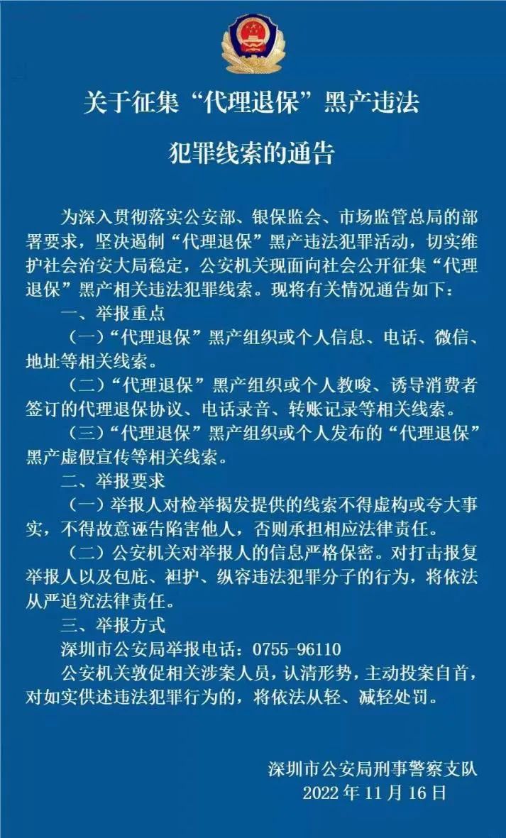 公安机关也在行动。据介绍,各地正在组织开展为期3个月的集中打击“代理退保”黑产违法犯罪专项行动。记者梳理发现,近期,深圳、海南、湖北、江西、重庆等多地公安机关发布公告,向社会征集“代理退保”黑产违法犯罪线索。举报重点包括:“代理退保”黑产组织或个人信息、电话、微信、地址等相关线索;“代理退保”黑产组织或个人教唆、诱导消费者签订的代理退保协议、电话录音、转账记录等相关线索;“代理退保”黑产组织或个人发布的“代理退保”黑产虚假宣传等相关线索。