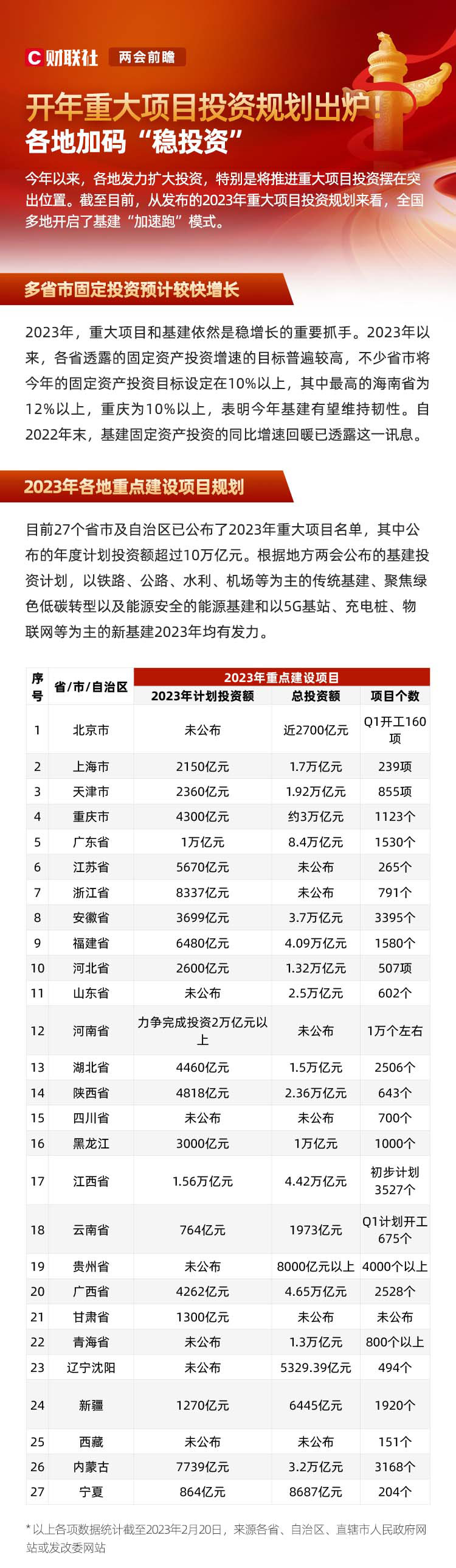 超10万亿!开年加码“稳投资” 27省市重大项目投资规划一览