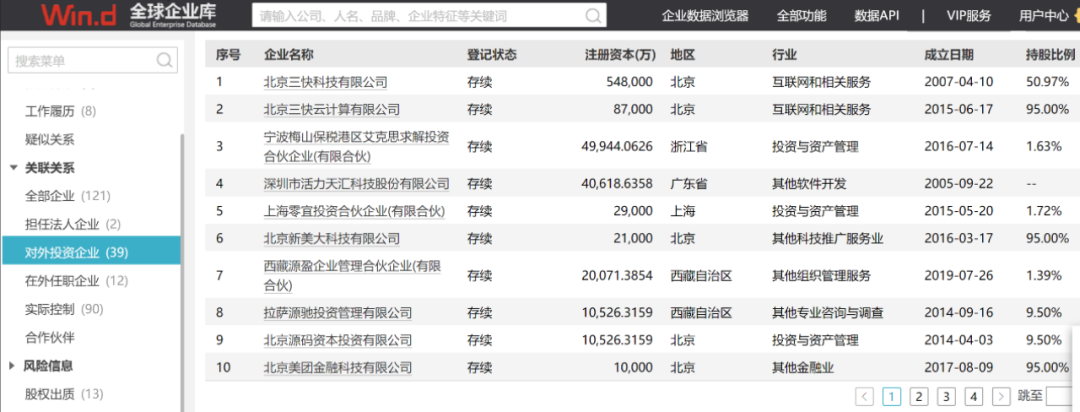 作为一位多次创业的成功人士,王兴个人的投资版图非常庞大。数据显示,王兴关联企业121家,对外投资企业39家,其中存续状态的有34家,包括北京三快科技有限公司、北京三快云计算有限公司、宁波梅山保税港区艾克思求解投资合伙企业(有限合伙)等。通过直接或间接持股,王兴拥有90家企业的实际控制权。其投资的企业主要从事科学研究和技术服务业、信息传输、软件和信息技术服务业及租赁和商务服务业,还有两家企业分别从事金融和文化、体育和娱乐业。