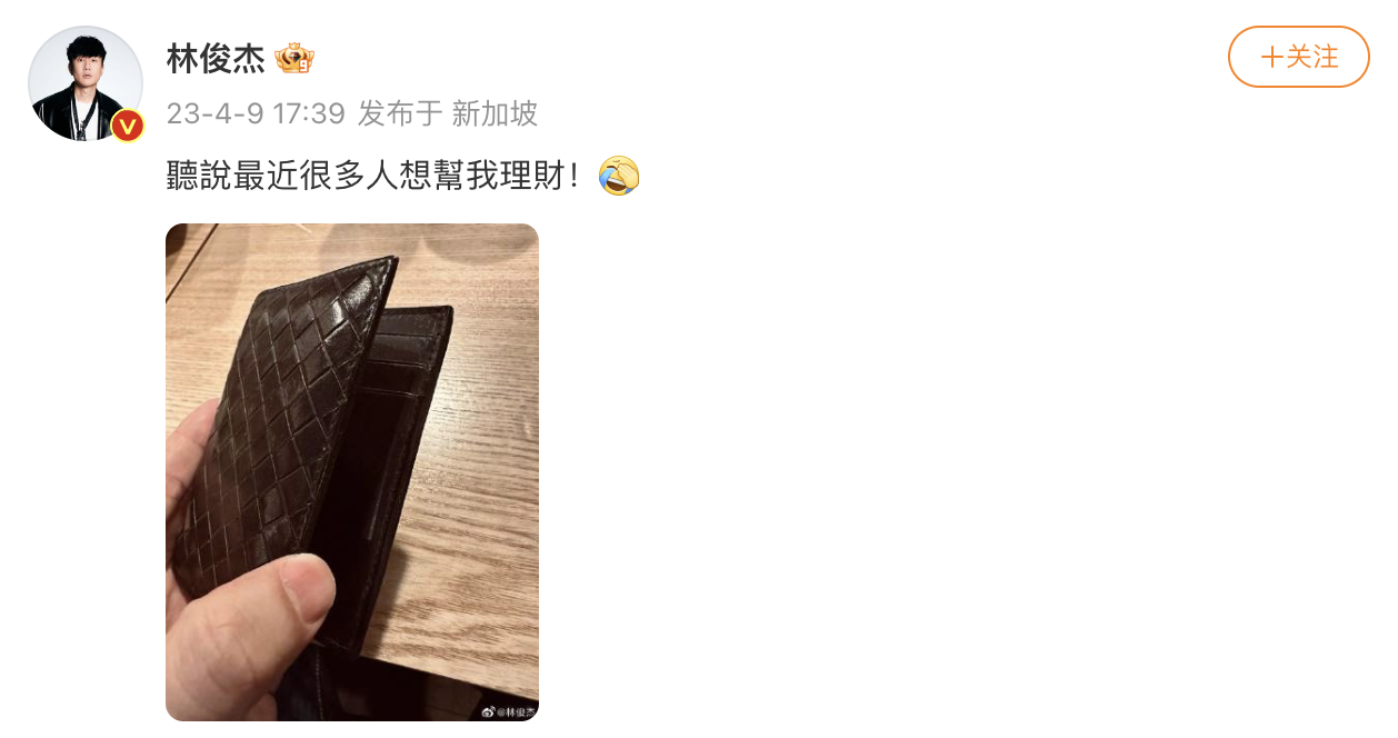 “听说最近很多人想帮我理财”,4月9日17点39分,歌手林俊杰在个人微博发文,并配以一张“钱包”的图片。