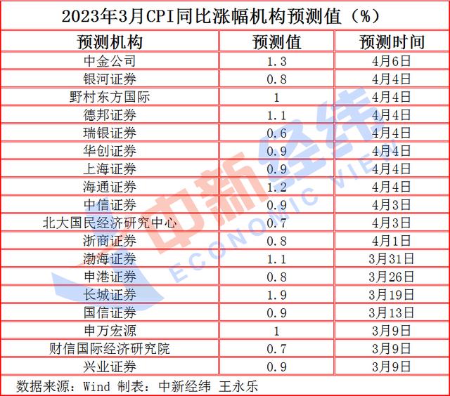 11日上午,国家统计局将公布2023年3月居民消费价格指数(CPI)。多家机构预测的均值显示,3月CPI同比上涨1%。