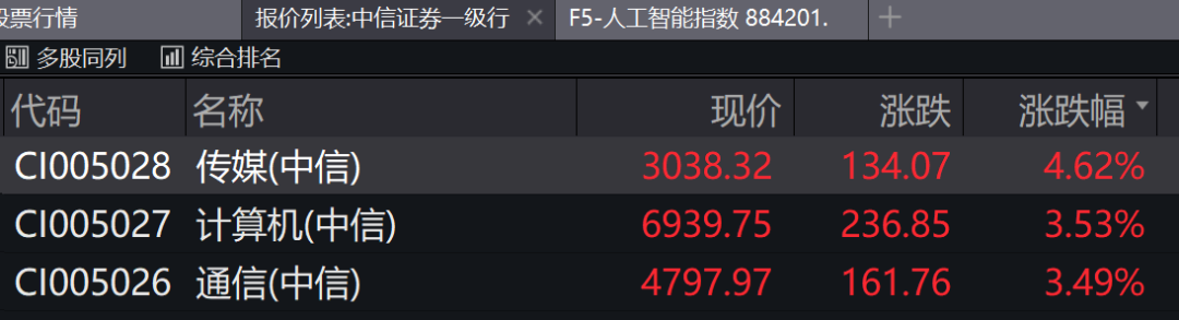 4月12日,由AI概念引爆的传媒、计算机相关板块行情愈演愈烈,截至上午收盘,中信一级传媒、计算机、通信指数分别上涨4.62%、3.53%和3.49%,继续领涨A股各大板块。