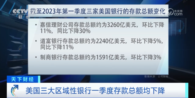 最新的消息,美国三大区域性银行第一季度的存款均出现了下降。具体来看,美国嘉信理财公司第一季度末的存款总额约为3260亿美元,较上一季度下降11%,较去年同期下降30%。美国道富银行第一季度末的存款总额约为2240亿美元,环比下降5%,同比下降11%。美国制商银行存款总额从去年年底的1635亿美元下降3%,至1591亿美元。