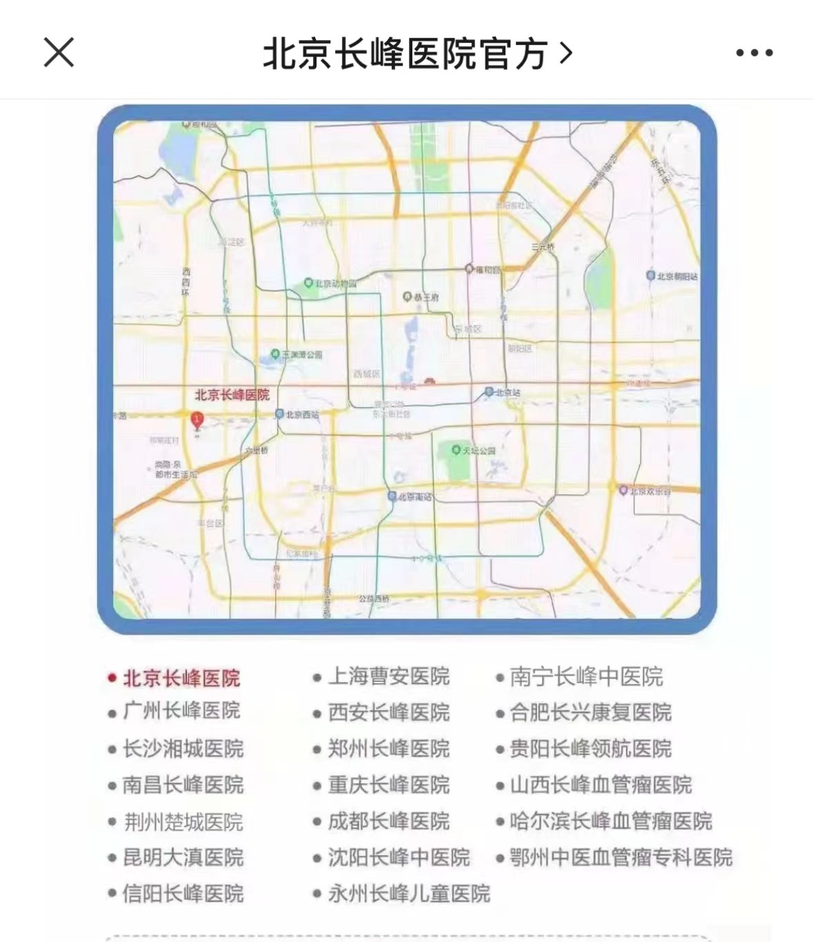 北京长峰医院官方公众号显示,该医院为首家血管瘤领域的新三板挂牌企业,且在上海、南宁、广州、西安等地开设20家连锁医院。