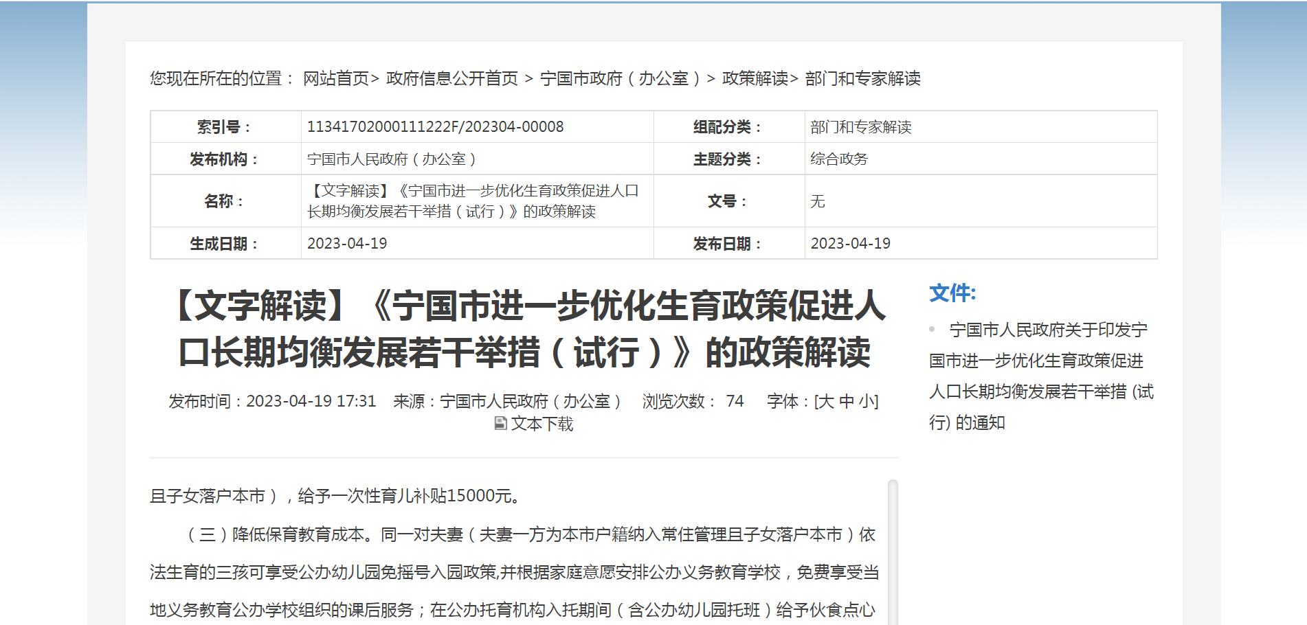 在此背景下,今年1月,宁国市相关部门开始起草更加具体的优化生育措施文件,经过了征求意见、专家论证等程序,进行了几个月的研究和打磨,于4月19日正式公开发布。