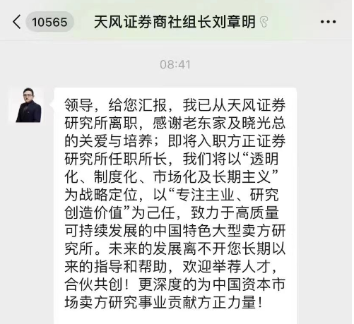 消息称,刘章明在发给一些机构的汇报消息中,已明确从天风证券离职,并感谢天风证券以及副总裁兼所长赵晓光的关爱和培养,同时,表示即将入职方正证券担任研究所所长。