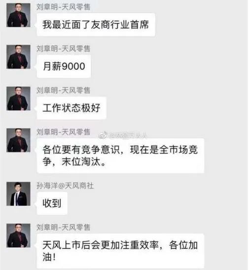 2018年10月18日,网传天风零售行业分析师刘章明聊天截图,刘在聊天中称“最近面了友商行业首席”,“月薪9000”。还称“现在是全市场竞争,末位淘汰。”