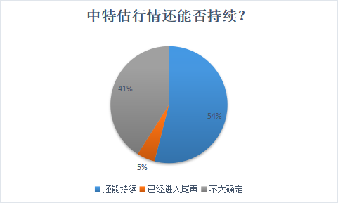 私募排排网一份包括近百家私募的调查结果显示,54%的私募认为中特估行情还能持续;另有41%的私募表示目前还不太确定中特估行情能否持续,需要进一步观察;仅有5%的私募认为中特估行情已经进入尾声,当前市场存量博弈,不支持中特估行情持续。