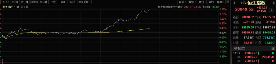 港股也被带飞。今天上午,港股早盘三大指数低开高走,恒指午间收涨0.14%,恒生科技指数基本平收。基本来说,比较平淡。不过,午后在A股回暖之后,港股市场全线发力。恒生指数涨幅扩大至2%,恒生科技指数涨1.9%。