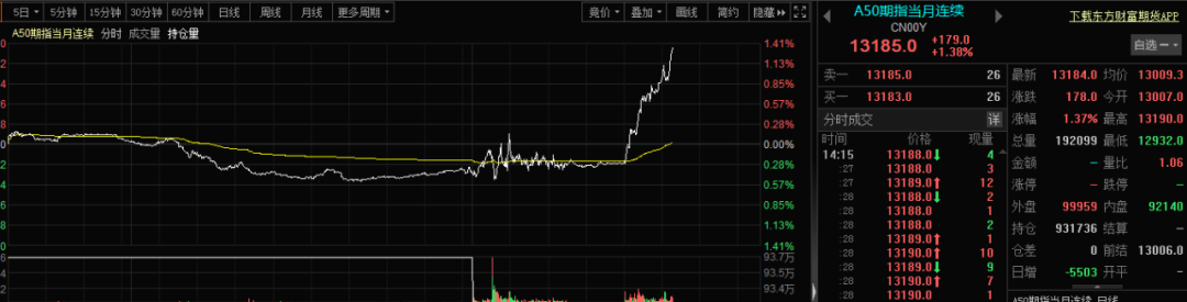 A50期指午后更是直线拉升。在下午两点十五分左右,北上资金净买入金额达到了46亿元以上。