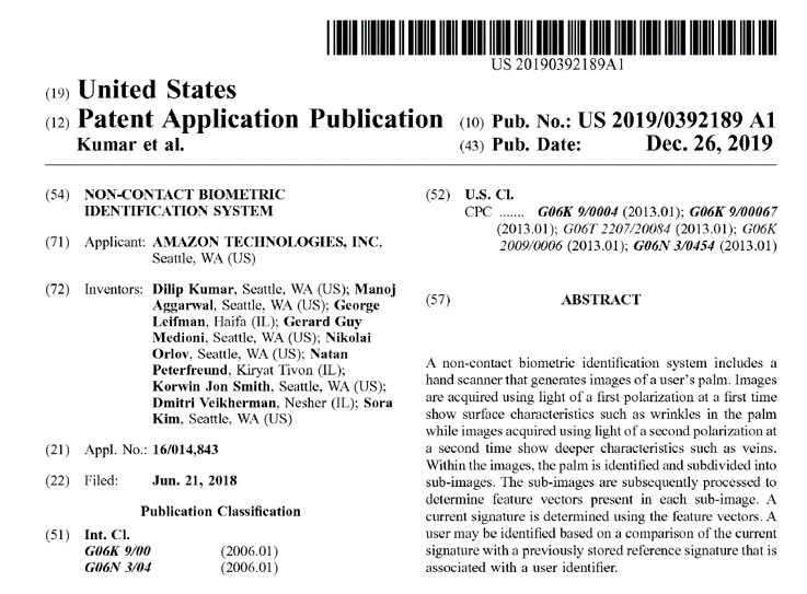 从当时的美国专利与商标局公布的亚马逊最新专利申请资料看,其发明的扫描仪设备是一种非接触式扫描系统,也是通过扫描掌纹和探测静脉纹路等手掌特征来识别用户身份。且这种扫描仪设备,不仅同时验证用户掌纹和静脉血管,还会扫描手掌内部的静脉、骨骼、软组织等情况,识别手部的血液流动或血压情况。