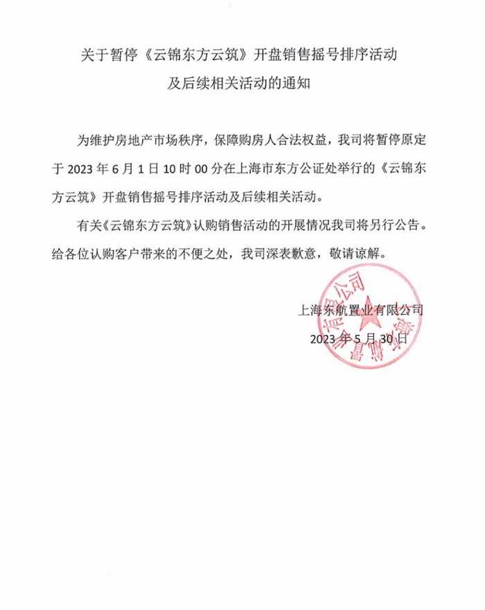 5月30日,上海东航置业有限公司发布《暂停<云锦东方云筑>开盘销售摇号排序活动及后续相关活动的通知》。通知称,为维护房地产市场秩序,保障购房人合法权益,将暂停原定于2023年6月1日10时00分在上海市东方公证处举行的《云锦东方云筑》开盘销售摇号排序活动及后续相关活动。开发商同时发布了认购金退款公告。