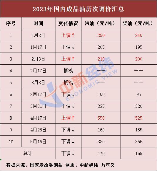 中新经纬梳理发现,此前,国内成品油在今年已历经十轮调整,汽油价格累计下调170元/吨,柴油价格累计下调165元/吨。此次价格上调如落实将成为年内第四涨,2023年成品油调价将呈现“四涨五跌两搁浅”的格局。