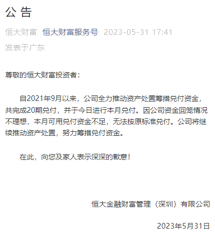 5月31日,恒大财富公告:因公司资金回笼情况不理想,本月可用兑付资金不足,无法按原标准兑付。