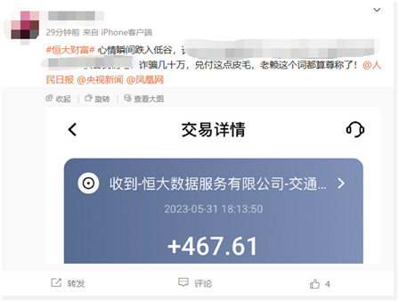 而到了2023年的5月底,恒大财富更是连每人每月2000元都无法兑付了。不少投资者在社交媒体上也“晒”出本次恒大财富的兑付金额,这一次更是仅兑付了467.61元。