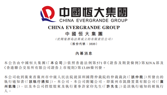 5月12日,中国恒大公告,公司收到广东省广州市中级人民法院就深圳国际仲裁院的仲裁裁决所发出的执行通知书。中国恒大,中国恒大附属公司广州凯隆置业有限公司,以及中国恒大控股股东、执行董事许家印是该执行通知的被执行人。