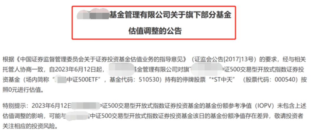 就在此前几日,某基金公司对旗下中证500 ETF持有的“*ST中天”自6月12日起按照0.11元进行估值;另一家大型基金公司也公告称,自2023年06月12日起,对旗下中证500 ETF及其联接基金持有的停牌股票“*ST中天”,按照0.01元/股进行估值。
