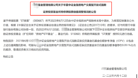 6月12日,某基金公司基金对北方一家公募旗下中证500ETF持有的停牌股票“*ST中天”按照0元进行估值。