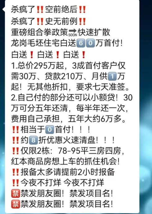 今年2月份,深圳龙岗区信诚缙悦花园开售,中介在发布的宣传海报中称“首付仅需30万元,买深圳全南向三房”。