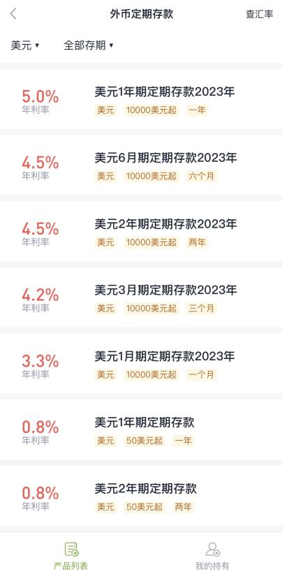 以苏州银行为例,当前该行“美元1年期定期存款2023年”年利率高达5.0%,1万美元起存;“美元6月期定期存款2023年”年利率为4.5%,同样1万美元起存。据官网显示,该行半年和一年期的人民币定期存款(整存整取)挂牌利率为1.6%和1.8%。