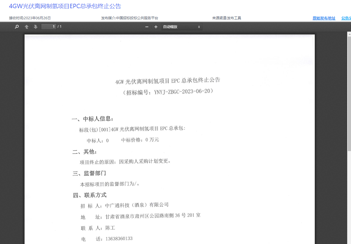 4GW光伏离网制氢项目EPC总承包终止 招标代理机构回应:后续应该还会发招标