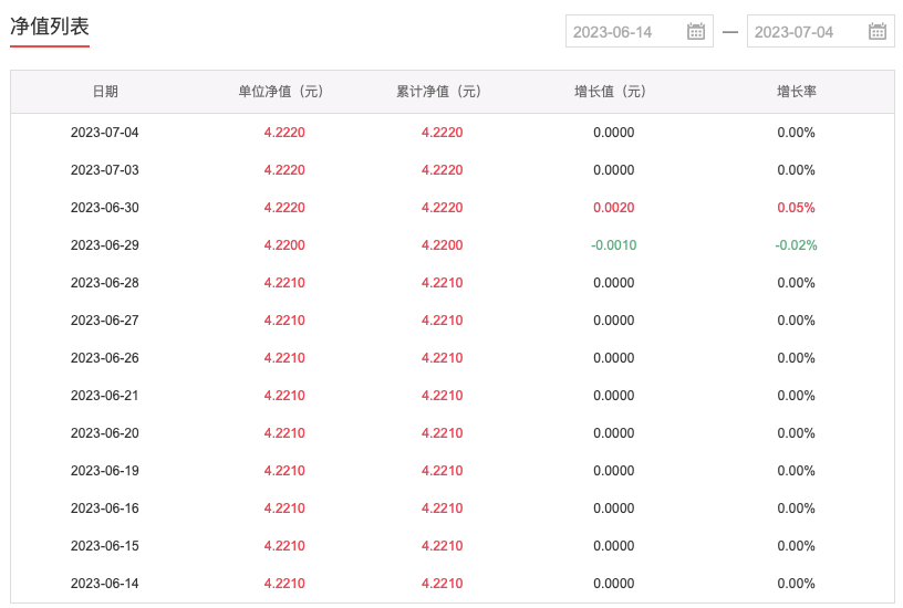 近日,有一只基金连续多日净值“纹丝不动”,让投资者有点懵圈。记者注意到,自6月14日以来,13个交易日中,有11个交易日的净值变动为0,其中从6月14日到6月28日,连续9个交易日没有任何变动,其余两个交易日的净值变动也不超过0.05个百分点。