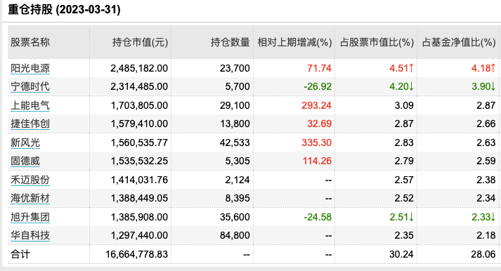从持仓来看,截至一季报,该基金前十大重仓股涉及电力设备、半导体、新能源、汽车产业链等相关热门赛道个股。