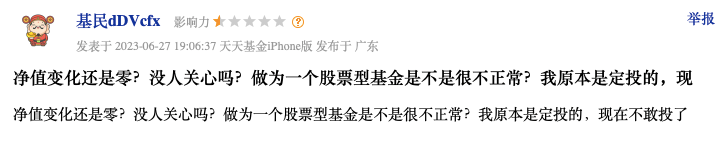 根据基金合同,股票等权益类资产合计市值占基金资产净值的比例为0%-95%,即使股票仓位降至0 也是允许的。但对于基金经理一季度股票仓位从7成加仓到9成,基金经理明明表示看好市场,却在二季度大幅反向操作,直接又从超9成的仓位“砍”到0仓位,很多投资者直呼看不懂,也有人表示,净值天天是零,已经不敢定投了。