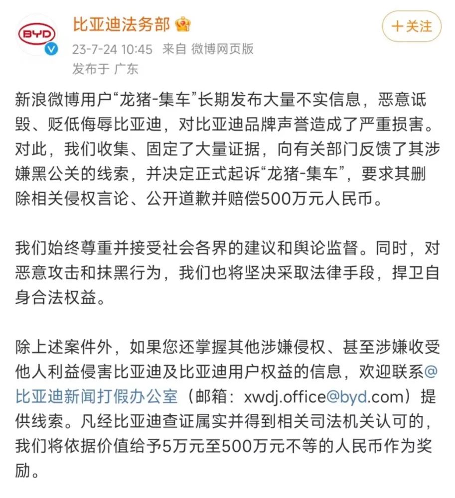 7月24日,比亚迪法务部官微发布微博称,新浪微博用户“龙猪-集车”长期发布大量不实信息,恶意诋毁、贬低侮辱比亚迪,对比亚迪品牌声誉造成了严重损害。对此,比亚迪收集、固定了大量证据,向有关部门反馈了其涉嫌黑公关的线索,并决定正式起诉“龙猪-集车”,要求其删除相关侵权言论、公开道歉并赔偿500万元人民币。