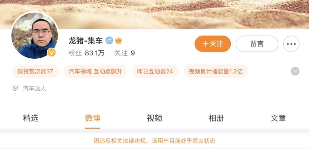 微博页面显示,截至发稿,“龙猪-集车”粉丝83.1万,因违反相关法律法规,目前处于禁言状态。