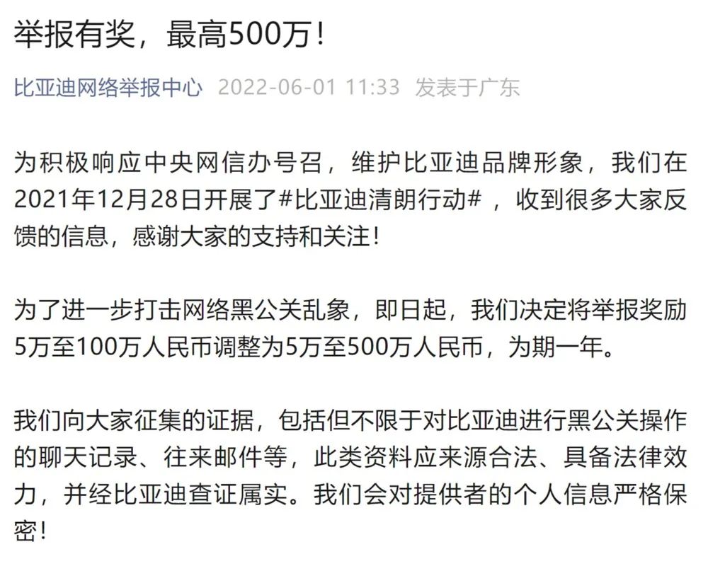 到了2022年,比亚迪加码了奖励。2022年6月1日,“比亚迪网络举报中心”发文称:“即日起,我们决定将举报奖励5万至100万人民币调整为5万至500万人民币,为期一年。”