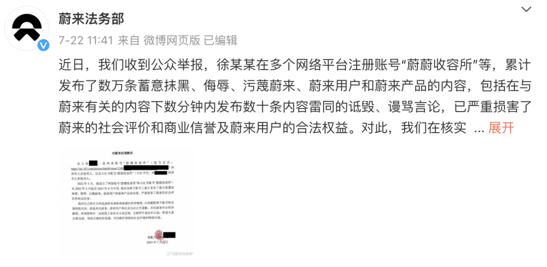 7月22日,蔚来法务部官方微博发文称:“近日,我们收到公众举报,徐某某在多个网络平台注册账号‘蔚蔚收容所’等,累计发布了数万条蓄意抹黑、侮辱、污蔑蔚来、蔚来用户和蔚来产品的内容,包括在与蔚来有关的内容下数分钟内发布数十条内容雷同的诋毁、谩骂言论,已严重损害了蔚来的社会评价和商业信誉及蔚来用户的合法权益。对此,我们在核实相关网络账号实际控制人身份并调查固定相关侵权证据后向上海法院正式提起诉讼,追究徐某某的相关法律责任。徐某某已于昨日正式签署道歉信,承认其违法侵权行为,注销相关网络账号,向蔚来、蔚来用户和社会公众正式道歉,赔偿相应损失,并已于今日正式公开道歉。”